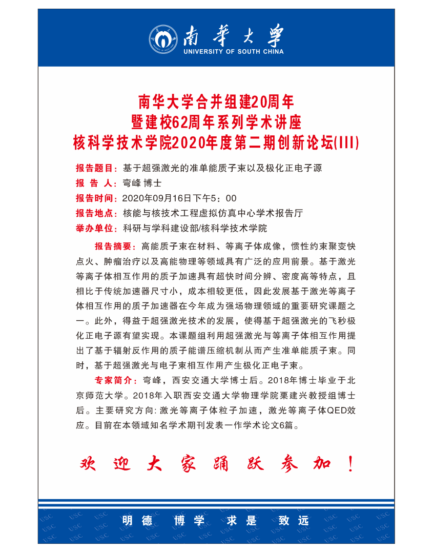 星空平台合并组建20周年暨建校62周年系列学术讲座--基于超强激光的准单能质子束以及化正电子源