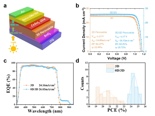 研究团队开创性地设计零维/三维(0D/3D)异质结架构(图1),采用CsSnI₃量子点作为多功能界面层,通过创新性的级联能级设计、表面钝化处理、防潮性能优化及光吸收增强等多重协同效应,显著提升了钙钛矿太阳能电池的能量转换效率与长期稳定性,为低成本、高性能光电器件的产业化应用开辟了新路径。未来可应用于建筑一体化光伏(BIPV)、柔性电子设备及空间能源系统等领域。