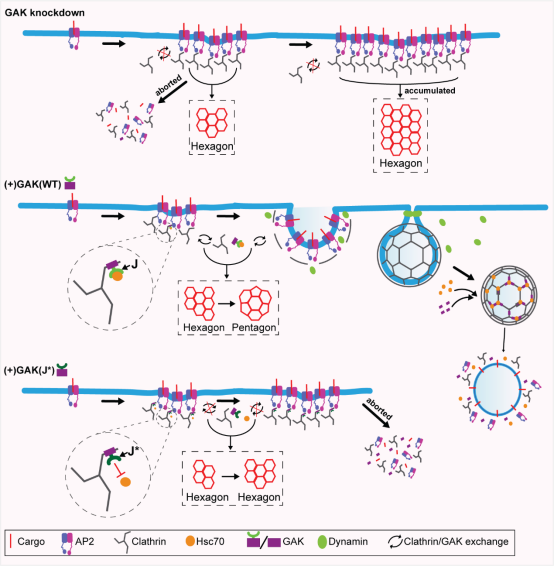 陈志明教授率领团队针对以上关键科学问题开展攻关研究,发现并证实:GAK基因(细胞周期蛋白G相关激酶)敲除会抑制CCPs的稳定化和内陷过程;当GAK的J结构域发生突变导致热休克蛋白Hsc70无法被募集并激活于CCPs时,会引发GAK在CCPs上的异常积聚,阻碍CCPs的稳定化与内陷,并显著增加高度瞬时性流产CCPs的比例。这些发现揭示了网格蛋白晶格重构的分子机制,支持GAK-Hsc70复合体可通过促进网格蛋白三脚复合体更替和晶格重构来推动CME事件所需的扁平向弯曲转变这一假说,为破解相关疾病发生、发展机制奠定重要的理论基础。