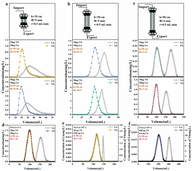 该研究实现了从材料设计、界面配位调控到动态柱分离工艺优化的系统集成,突破了镥/镱(Yb/Lu)高化学相似性带来的分离限制,为无载体添加型177Lu医用同位素的高效制备提供了切实可行的新方案。该研究成果不仅为177Lu等重要医用核素的大规模、高纯度制备奠定了材料与工艺基础,也为其他关键医用放射性核素的分离纯化提供了有益借鉴。