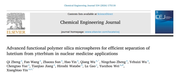 近日,星空平台核科学技术学院殷祥标教授团队在国际权威期刊Chemical Engineering Journal(中科院一区TOP, IF= 13.2)发表题为“Advanced functional polymer silica microspheres for efficient separation of lutetium from ytterbium in nuclear medicine applications”的研究论文。该研究面向核医学与放射性药物制备中关键医用同位素分离纯化的难题,设计并构建了一种基于高分子功能化的二氧化硅复合高效柱分离材料,为医用同位素镥-177(177Lu)的高纯制备提供了新的技术路径,也为关键医用放射性核素分离材料的开发提供了新的研究思路。